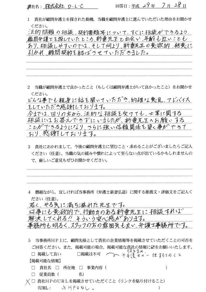 法的問題の相談、契約書類等について、すぐ相談ができるよう、顧問弁護士を探していたところ、新妻先生と出会い、年齢も近いこともあり、相談しやすいのでは、そして何より新妻先生の意欲的、熱意に引かれ、顧問契約を結ばさせていただきました。
