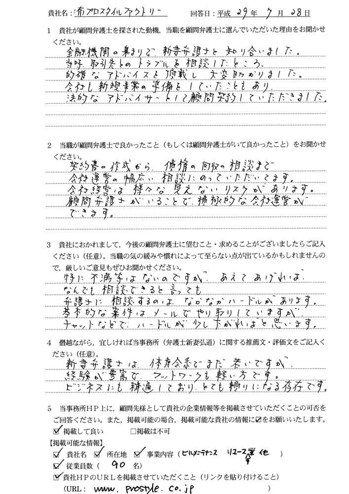 金融機関の集まりで、新妻弁護士と知り合いました。 当時、取引先とのトラブルの相談ををしたところ、的確なアドバイスを頂戴して大変助かりました。 会社も新規事業の準備をしていたこともあり、法的なアドバイザーとして顧問契約していただきました。