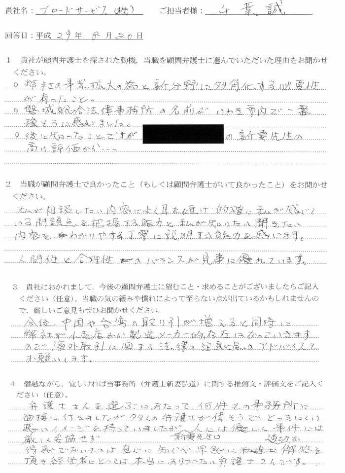 ・弊社の事業拡大の為と新分野に多角化する必要性が有ったこと。 ・磐城総合法律事務所の名前がいわき市内で一番強そうに感じました。 ・後に知ったことですが○○君の新妻先生の高い評価から・・・